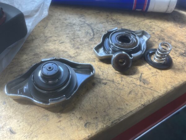 なんかバラバラになっていました・・・負圧弁が損傷している状態でした。この状態だと圧力がかからなくなるので沸点を上げることができなくなり、100℃とかで冷却水が沸騰しだしたりしてオーバーヒートしやすくなったりします。