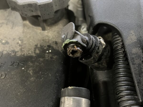 点検してみるとリザーブタンクから出ている細いホースがボロボロになっていて折れてしまっていました。このエンジンよくココ折れる気がします・・・まぁ外車の樹脂部品やゴム部品ボロボロになりやすいし・・・