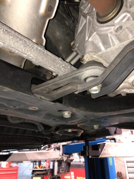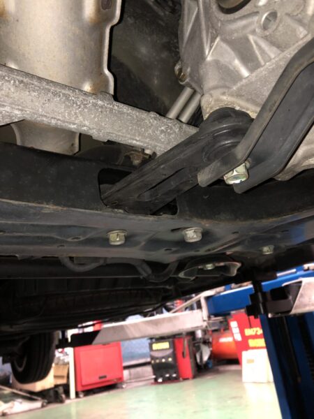 エンジン下部についている平べったい板状の物が今回交換するマウントです。
